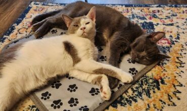 Obi (Oatmeal) & Isaac (Steve) came home with Dave and I last July. They were very timid and hid together behind our toilet, except to play and wrestle with each other. It was a slow start, but with a lot of love the boys have warmed up to us. So far, Isaac is the affectionate, in-your-face, loving type and Obi is more the rough-and-tumble adventurous type. Together they bring us an enormous amount of entertainment and joy. We have absolutely loved watching them come out of their shells, and can’t wait to see how they mature into adult cats. Thank