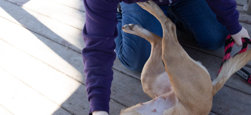 It is a story that trainers often hear: “My dog rolled over asking for a belly rub from the neighbor, and then out of the blue bit her when she touched him.” While dogs do often roll on their backs to solicit petting, this can mean something completely opposite as well, so it is important to know the difference. “Tapping out,” as it is often called, describes when the dog rolls on their back and exposes their belly in an appeasement gesture that is meant to request space. A dog who is tapping out does NOT want to be touched, and continued attempts to pet may result in a bite. How do you tell the difference? A dog that wants petting will often be fully on their back, with a loose body, legs outstretched, writhing around, with an relaxed face and mouth. A dog that is tapping out will usually have tense body and facial muscles, be lying partially on their side with one flank lifted, eyes wide so that the whites are visible, mouth closed, and may show other signs of stress such as lip licking.