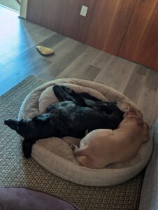 Nigel wasn’t our first rescue, but he was our first adult dog rescue. It didn’t take him long to decompress from the shelter and make himself right at home. He and our other dog, Gonzo, were almost immediate besties. We have six dog beds in the house and they regularly sleep on the same one! Nigel is smart, silly and oh, so sensitive. He loves naps, walks, playing keep away (he doesn’t really fetch), snugs and snacks. We couldn’t imagine life without him. Happy Gotcha Day, Nigel, and thank you HSHV for all that you do!